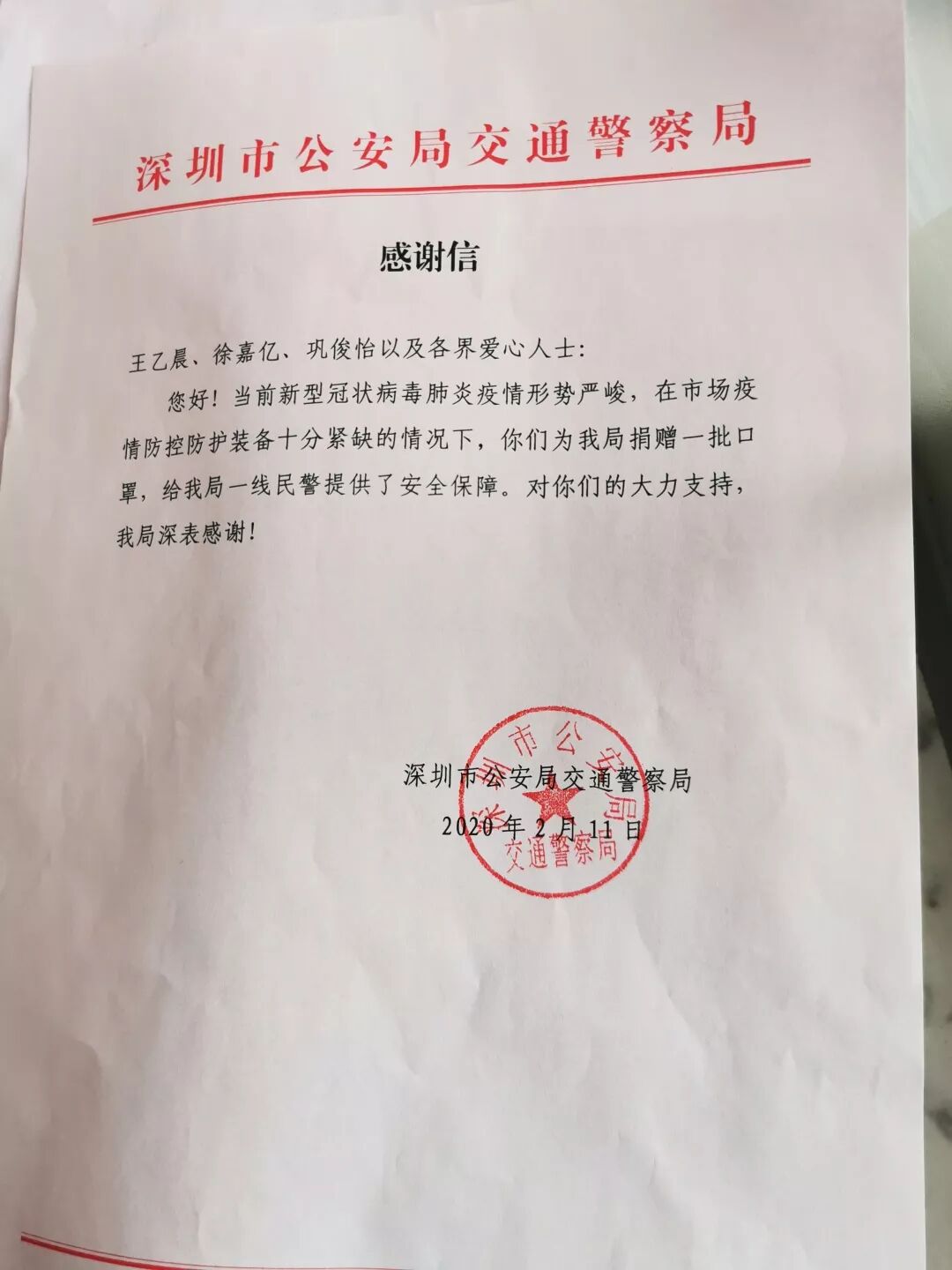 “这 是一个很偶然的机缘,其实从疫情开始之后就有过捐赠的想法,但一直没有货源渠道。之后因为父母在海外的朋友而得到了这次的一批口罩,又想到之前在检疫处看 到很多交警哥哥姐姐们带的都是普通一次性口罩,对于每日工作在外的他们来说保护性能很差,就有了想帮助他们的想法。沟通过后也得知了他们对物资的需求量之 大,就敲定了我们的捐赠对象。”